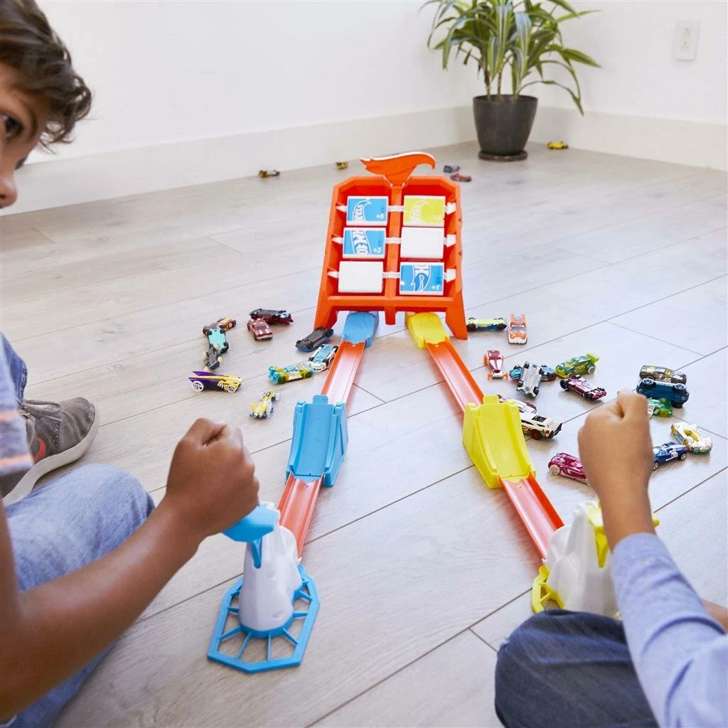 Lukt het jouw als eerste alle panelen om te draaien met de Hot Wheels Launch Across Challenge? Schiet je auto af, lanceer hem en probeer zo de panelen in blauw of geel te draaien. Zorg wel dat ze allemaal 1 kleur hebben! Je kunt je auto er ook onderdoor laten rijden om de panelen om te draaien. Oefen erop los of ga de strijd aan tegen een vriend!