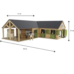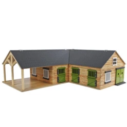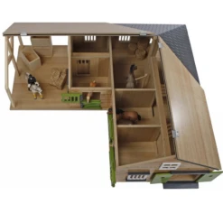 Realistische paardenstal met vier boxen op schaal van 1:24, en hiermee perfect voor de Schleich paarden. De deuren en ramen kunnen open en dicht en het dak werkt met een scharnier en kan open geklapt worden zodat kinderen makkelijk in de stal kunnen spelen. De stal is van hout en zeer gedetailleerd van de speelbeleving en fantasie ten goede komt.