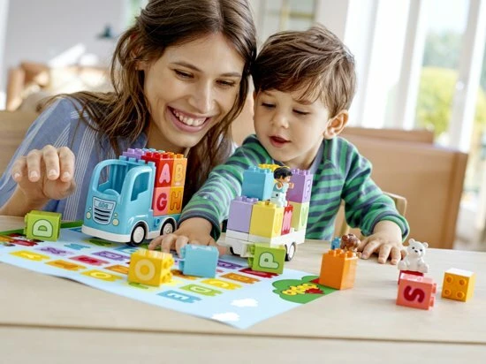 - Je hebt geen batterijen nodig om de LEGO® DUPLO® alfabet vrachtwagen te laten rijden – de fantasie van kinderen is genoeg. Praktisch speelgoed zonder batterijen brengt creatief spel binnen handbereik van kinderen, waardoor zij hun fijne motoriek en ruimtelijk bewustzijn kunnen ontwikkelen.
