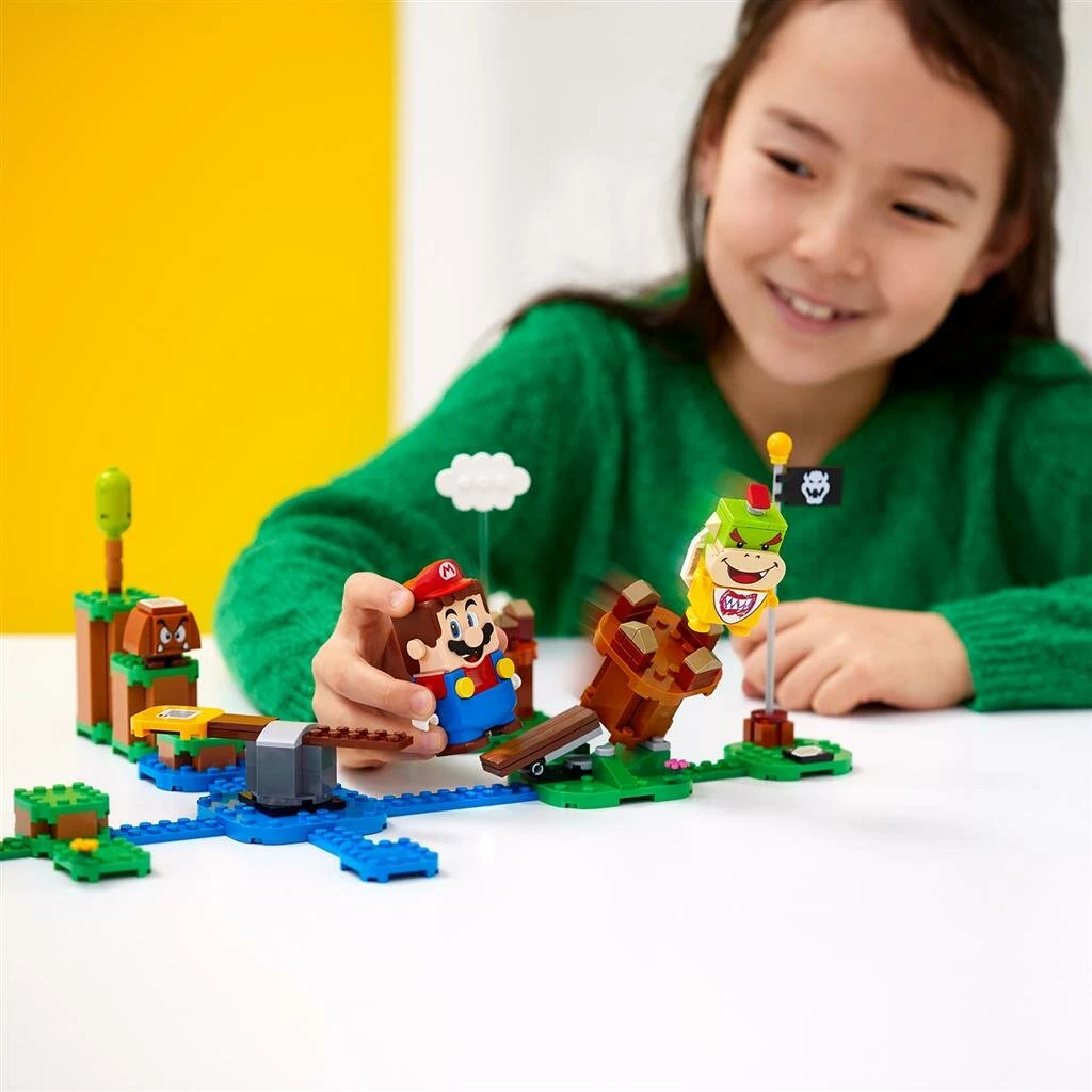 Speel als je favoriete Super Mario™ personage in de echte wereld met deze leuke startbaan! De LEGO® Mario™ figuur geeft via de lcd-schermen en luidspreker directe reacties. Verdien virtuele munten door met LEGO Mario van de Startbuis naar de Vlaggenmast te gaan via draaiende platforms en wolkenplatforms, het ?-blok en supergevechten met de Goomba en Bowser Jr. speelgoedfiguren.