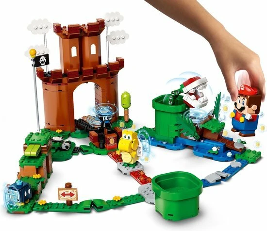 Voeg het spannende avontuur in de Bewaakte vesting toe aan jouw LEGO® Super Mario™ startset! Ren over het gras en spring op de katapult om de Koopa Troopa te verslaan en spring daarna op het platform om de vlag te hijsen. Of spring over lava en versla de Bob-omb. Neem de route over water en ga de strijd aan met de Piranha Plant. Alle 3 de wegen leiden naar het POW-blok, waarmee de poort van de vesting wordt geopend en jij munten verdient!