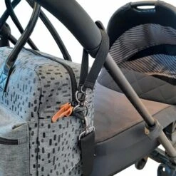 De verzorgingstas op verschillende manieren te dragen en mee te nemen. Zo heeft hij twee handvaten, maar ook een schouderband zodat hij over een schouder gehangen kan worden. Loop je met de kinderwagen, dan heeft de tas een extra drukknopsysteem waardoor hij aan de kinderwagen te hangen is.