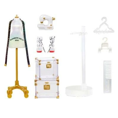 Modepop, 2 complete, unieke poppenoutfits, 2 paar trendy schoenen met 2 doorzichtige modekoffers om schoenen en accessoires in op te bergen. Hoogwaardige verzamelmodeaccessoires zoals een mininaaimachine, rollende paspop gewikkeld in stof, sjaal als meetlint, kam, 2 kledinghangers en poppenstandaard.