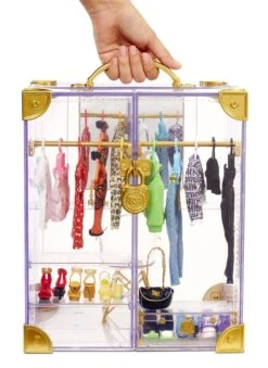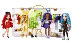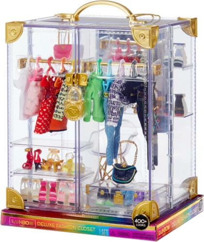 De Rainbow High Luxe kledingkast-speelset is inclusief een regenboog aan mode om te mixen en matchen en zo meer dan 400 glamoureuze looks te creëren. Geniet van eindeloos modespeelplezier met meer dan 31 mode-onderdelen, inclusief poppenjurken, -broeken, -rokken, -tops, -schoenen en alle geweldige poppenaccessoires zoals oorbellen, riemen en tasjes, voor eindeloos veel mix- en matchplezier. Nadat je pop haar favoriete mode en accessoires heeft gekozen, kan ze in haar kapstoel van plexiglas gaan zitten om haar outfit te bewonderen in de kapspiegel! De set bevat doorzichtige schoenenvitrines om je poppenschoenen of andere poppenaccessoires in op te bergen. Gebruik de kledinghangers om al je poppenkleding op te hangen in de kledingkast.