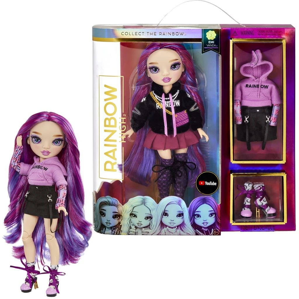 Rainbow High Emi Vanda pop is uniek en helemaal in het donkerpaars gekleed. Dit is ook haar lievelingskleur en zelfs haar haren zijn paars. Ze maakt haar eigen kleding en haar mode items zijn voorzien van prachtige details. Samen met haar vriendinnen heeft ze een leuke tijd op de Rainbow High school. Deze Rainbow High pop houdt van visuele kunst, dit is ook haar hoofdvak. Via haar kleding komt haar kunst weer naar boven en ze is een tikkeltje mysterieus in haar gedurfde looks.