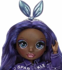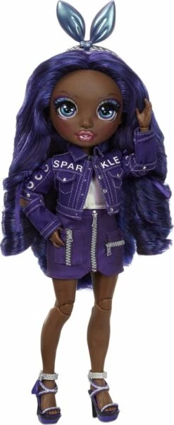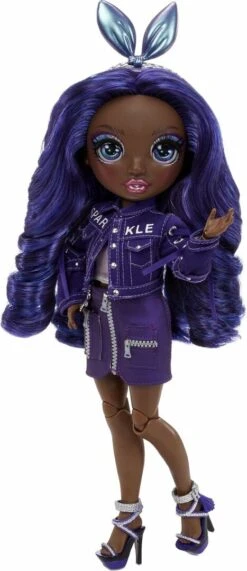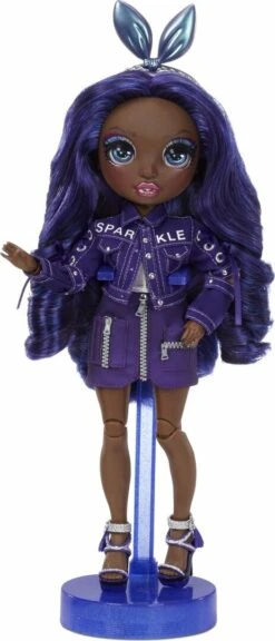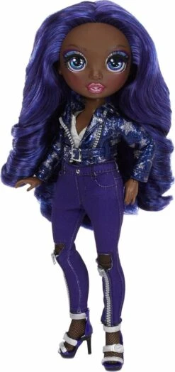 Verzamel een hele regenboog aan schitterende modepoppen met Rainbow High. Maak kennis met Krystal Bailey. Ze is van top tot teen gekleed in het indigo (tussen blauw en paars), heeft een prachtig gezichtje, lange wimpers en supermooi, borstelbaar haar. Ze is volledig beweegbaar en poseerbaar. Haar armen en benen zijn buigbaar, zodat je haar in allerlei glamoureuze houdingen kunt zetten. Inclusief 2 complete outfits om te mixen en matchen voor opvallende, adembenemende looks. Krystal heeft een trendy stijl met veel details waarmee ze altijd de voorpagina’s haalt. Trek haar haar twee chique jasjes, de rok met veel details, spijkerbroek, tops, 2 paar trendy hakken en meer aan. Ook inbegrepen zijn een haarkam, twee kledinghangers en een poppenstandaard.