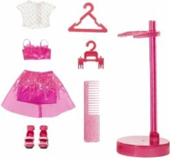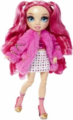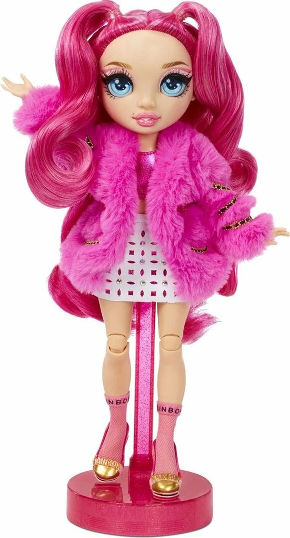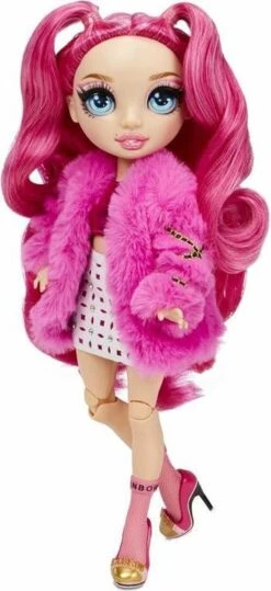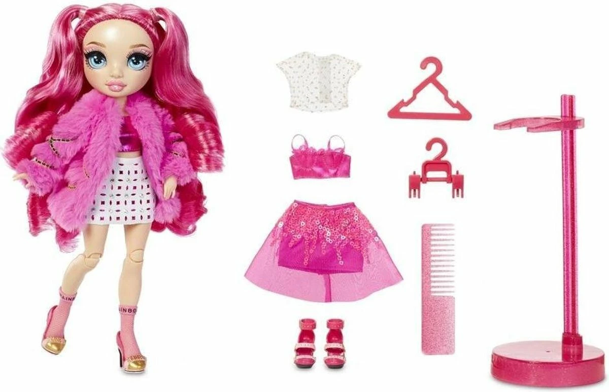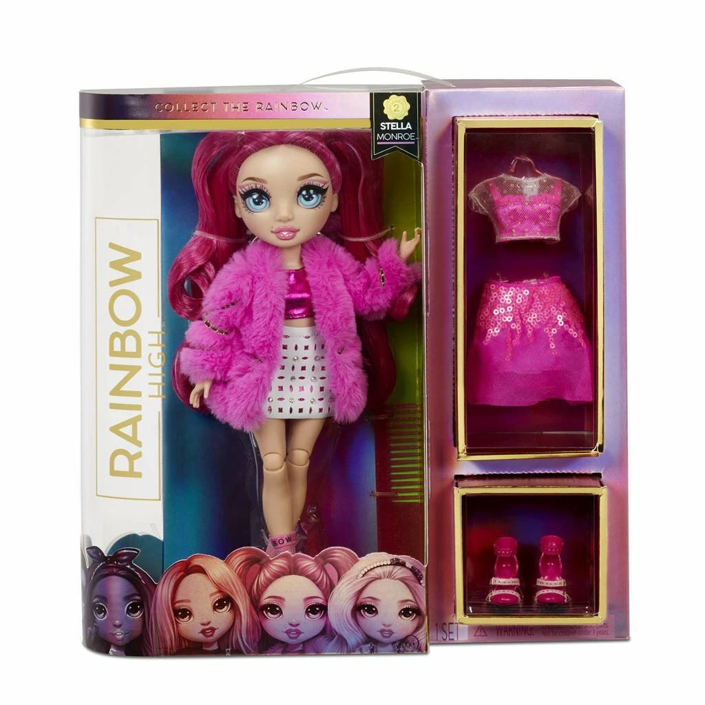 Verzamel een hele regenboog aan schitterende modepoppen met Rainbow High. Maak kennis met Stella Monroe. Ze is van top tot teen gekleed in fuchsiatinten (donkerroze), heeft een prachtig gezichtje, lange wimpers en supermooi, borstelbaar haar. Ze is volledig beweegbaar en poseerbaar. Haar armen en benen zijn buigbaar, zodat je haar in allerlei glamoureuze houdingen kunt zetten. Inclusief 2 complete outfits om te mixen en matchen voor opvallende, adembenemende looks. Stella heeft een expressieve stijl die allesbehalve traditioneel is. Trek haar haar twee tops, twee rokken met veel bling, jasje van nepbont, 2 paar stijlvolle hakken en meer aan. Ook inbegrepen zijn een haarkam, twee kledinghangers en een poppenstandaard.