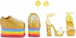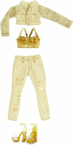 Sunny is inclusief 2 complete outfits om te mixen en matchen voor opvallende, adembenemende looks. Van Sunny’s eigenzinnig-schattige stijl moeten al haar BFFs glimlachen. Haar outfits: een glinsterjurk, twee jasjes, regenboogsokken, glinsterjeans en meer! Haar gouden regenboogschoenen met blokhak zijn next level. Ook inbegrepen zijn een haarkam, twee kledinghangers en een poppenstandaard.