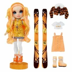 Rainbow High Fashion Winter Doll Poppy Rowan. De 6 oorspronkelijke Rainbow High modepoppen krijgen een winterse make-over, zodat ze megamodieus de pistes kunnen afglijden met hun vrienden en vriendinnen. Elke modepop is gekleed in haar lievelingskleur (Poppy houdt van oranje) en heeft haar eigen stijl. Met deze speelset kunnen kinderen fantasievolle en creatieve verhalen verzinnen voor urenlang speelplezier. Deze wintersportvakantie-speelset bevat een modepop, 2 complete poppenoutfits, 2 paar poppenschoenen, onmisbare poppenaccessoires zoals oorwarmers, snowboots, ski’s met echt werkende bindingen en kam. Je kunt de ski’s ook gebruiken als poppenstandaard met winterthema. Trek haar elke look aan, of mix en match de trendsettende mode! Ze is volledig beweegbaar en poseerbaar. Je kunt haar laten poseren en met haar spelen op de ski’s.