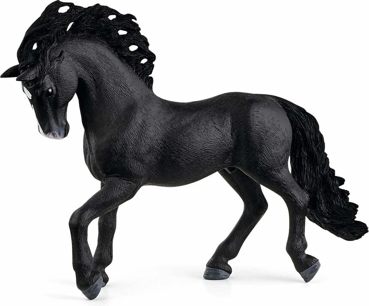 Deze Schleich hengst zit vol trots. Hij is zwart en heeft een elegant hoofd met een mooie geboven nek en net als de Spaanse merries mooie golvende manen en een volle staart. Dit paardenras wordt vaak verward met Andalusiërs, dit komt omdat ze toch wel op elkaar lijken. Uit deze Spaanse lijn zijn ook de Schleich merrie en het Schleich veulen verkrijgbaar.