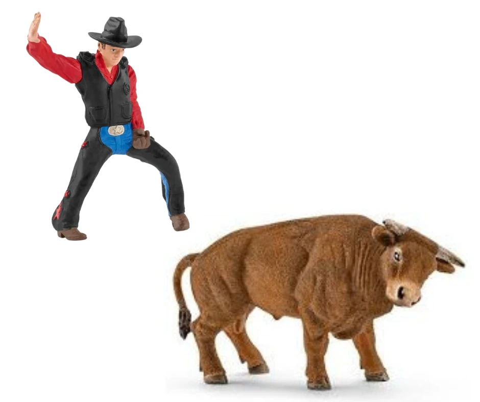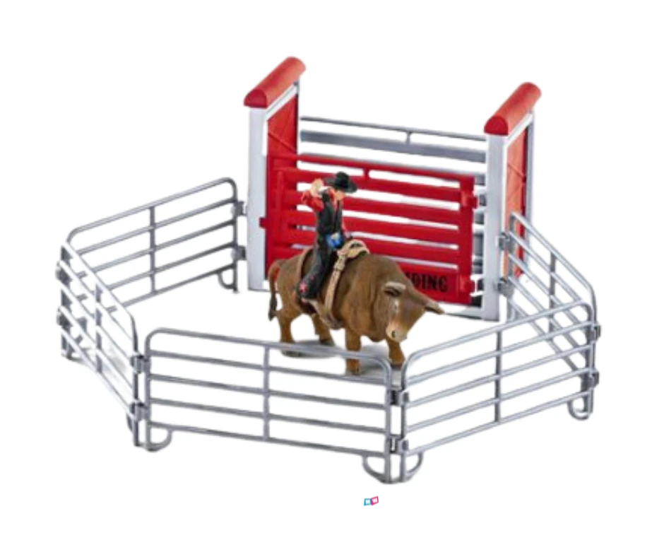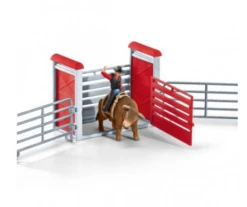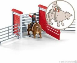 Deze Schleich speelset komt met een Schleich stier, cowboy en enkele accessoires die een echte stierenrijder nodig heeft. De Schleich cowboy houdt zich goed vast aan het touw rond de stier want het doel is om minimaal 8 seconden te kunnen blijven zitten. Dit is nog een hele klus want de stier rent als een dolle door het afgezette stuk paddock