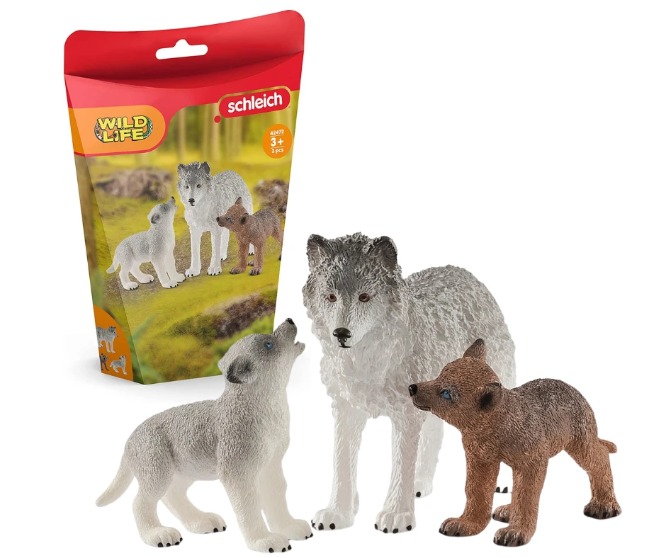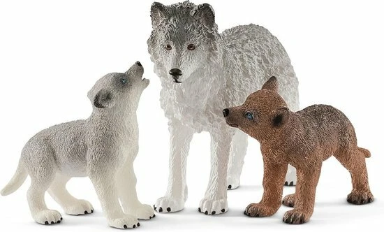 Deze Schleich wolven speelset van Schleich bevat een moederwolf met twee welpen. De Schleich wolfjes zijn blind geboren en pas na twee weken gaan langzaam hun oogjes open en beginnen ze de wereld te verkennen. De Schleich wolven zijn pas volwassen en in staat een eigen roedel te vormen als ze twee jaar oud zijn.
