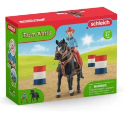 Deze Schleich cowgirl is een echte stoere meid. Samen met haar paard gaat ze op volle snelheid tussen de tonnen door. Haar paard kan razendsnel wenden en draaien. De bedoeling is om op volle snelheid rond de tonnen te rennen en te draaien, en die strijd gaat ze graag aan met de andere cowboys en girls.