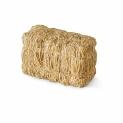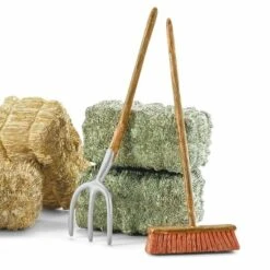 1 x hooibaal, 1 x strobaal, 1 x hooivork, 1 x bezem, 2 x wortelen, 1 x zak met haver, 1 x zak met pellets, 2 x voerkist, 2 x appel rood, 2 x appel groen