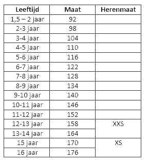 | Kindermaten | 98, 104, 110, 116, 128 |
