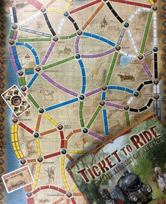 Met deze Ticket to Ride Africa kan je treinroutes leggen dwars door Afrika. Hiervoor moet je door het oerwoud, door de woestijn en over de bergen reizen. Nieuw bij deze uitbreiding is dat de waarde van routes verdubbeld kunnen worden met behulp van terreinkaarten.
